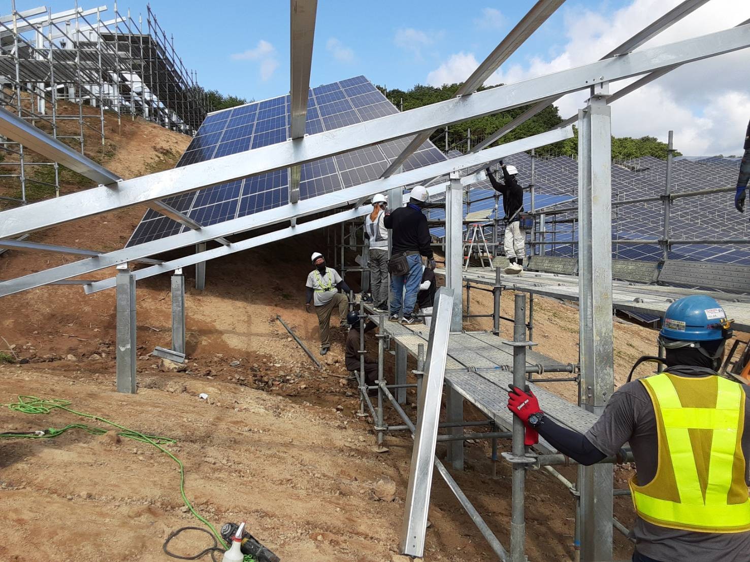 大規模メガソーラーから定電圧の小規模ソーラーの造成・杭・架台・パネル・フェンス・配電の全ての工事実績を積み、高い評価を頂いております。